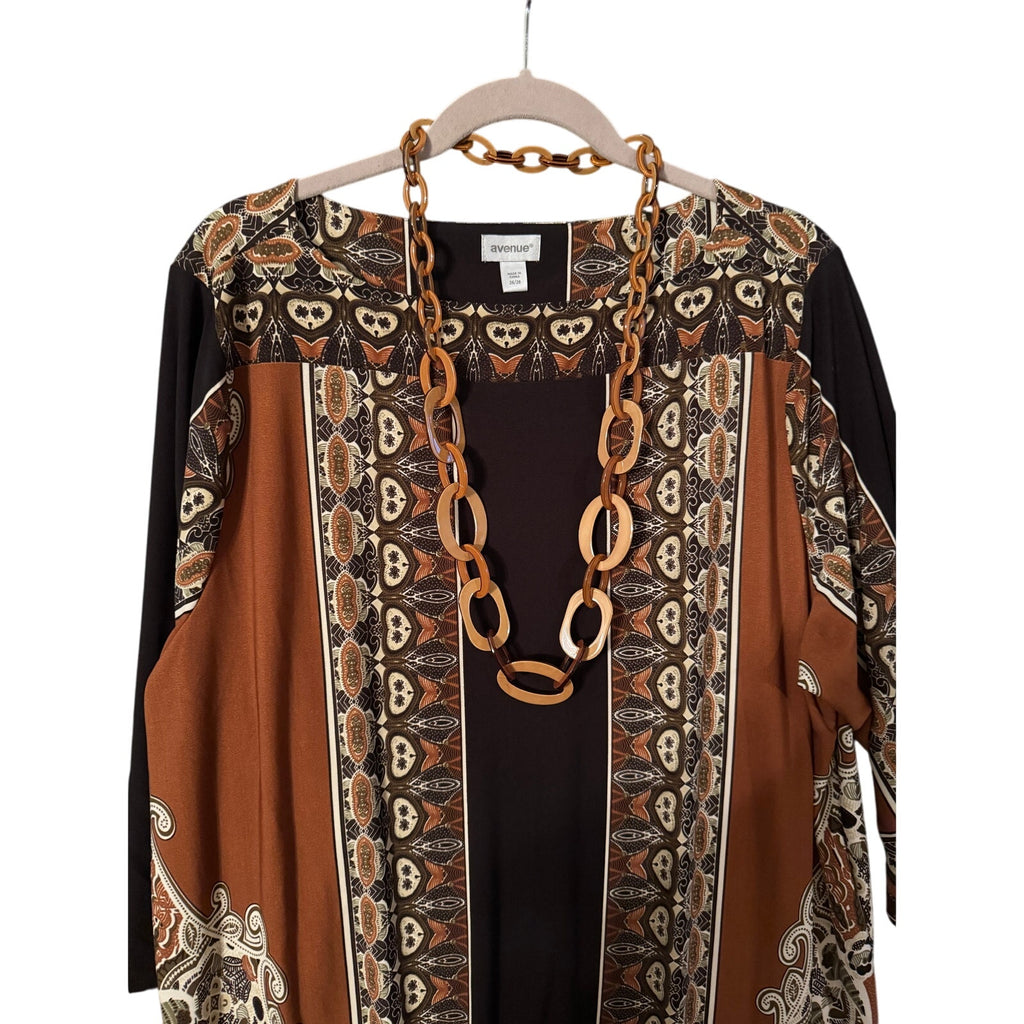 This Avenue boho-inspired dress combines comfort and sophistication in a soft jersey. Designed with a flattering boat neckline and long sleeves, it offers an effortless drape that moves beautifully. The rich brown and black tones with intricate border prints create a slimming, elegant look perfect for any season. Pair it with boots or heels for a stylish day-to-night outfit.