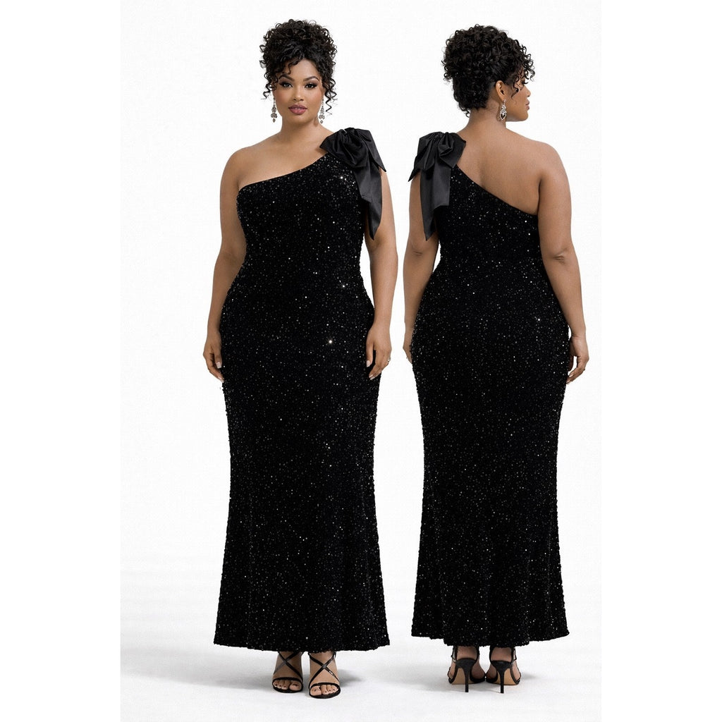 Black Sequin One-Shoulder Gown with Satin Bow – Size 4X (20–22)