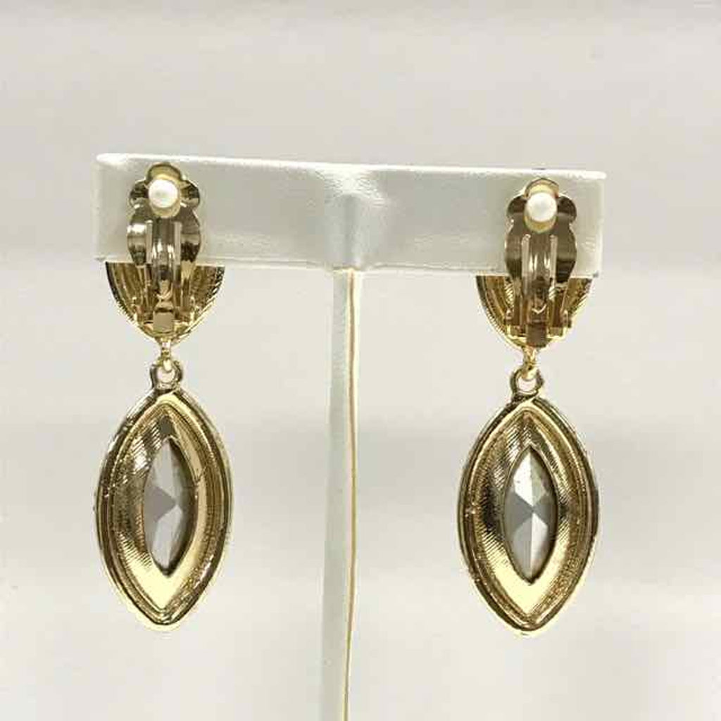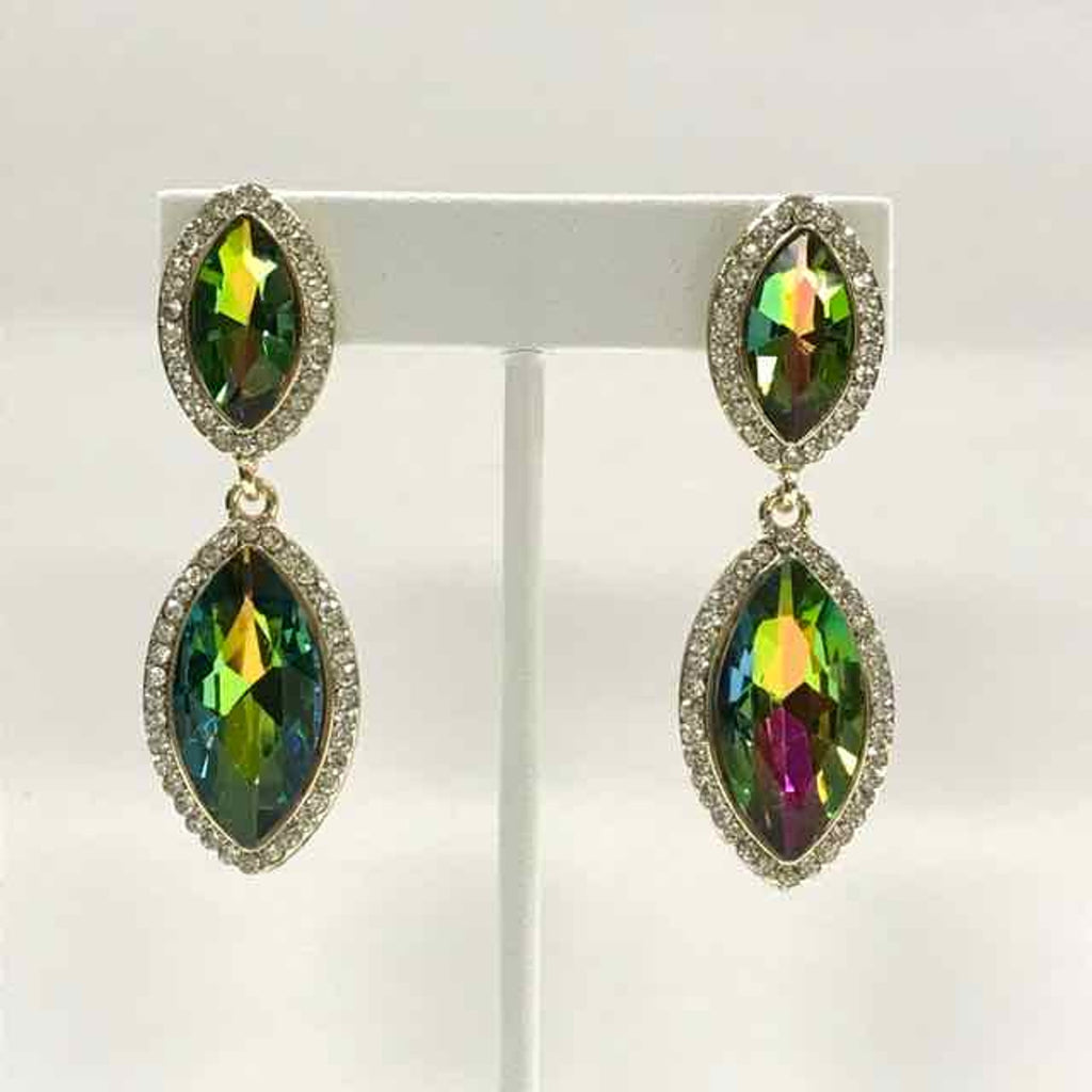 Make a bold statement with these dazzling clip-on earrings. Featuring marquise-cut Aurora Borealis glass crystals that shift beautifully between green, gold, and hints of fuchsia/blue, these earrings bring radiant sparkle from every angle. Each stone is haloed with clear rhinestones for added brilliance, set in a classic gold-tone backing.