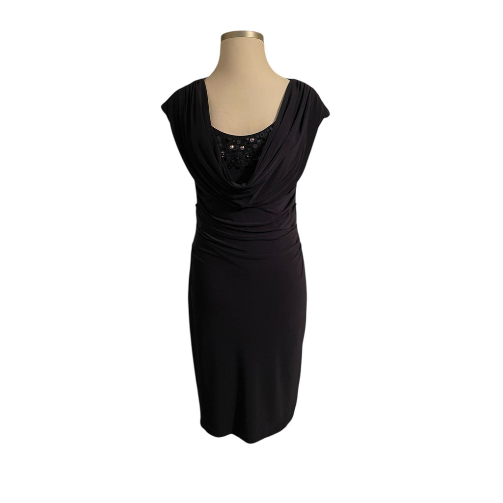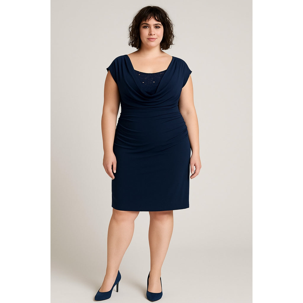 Step into timeless elegance with this stunning Jones New York sheath dress in rich navy. Designed with a flattering draped cowl neckline and subtle sequin beading at the bust, this dress combines sophistication with a touch of sparkle. The double-layered poly-spandex fabric provides a slimming shapewear effect, while the side tucks create a smooth, figure-enhancing silhouette. Perfect for evening events, cocktails, or any special occasion where you want to look effortlessly chic.
