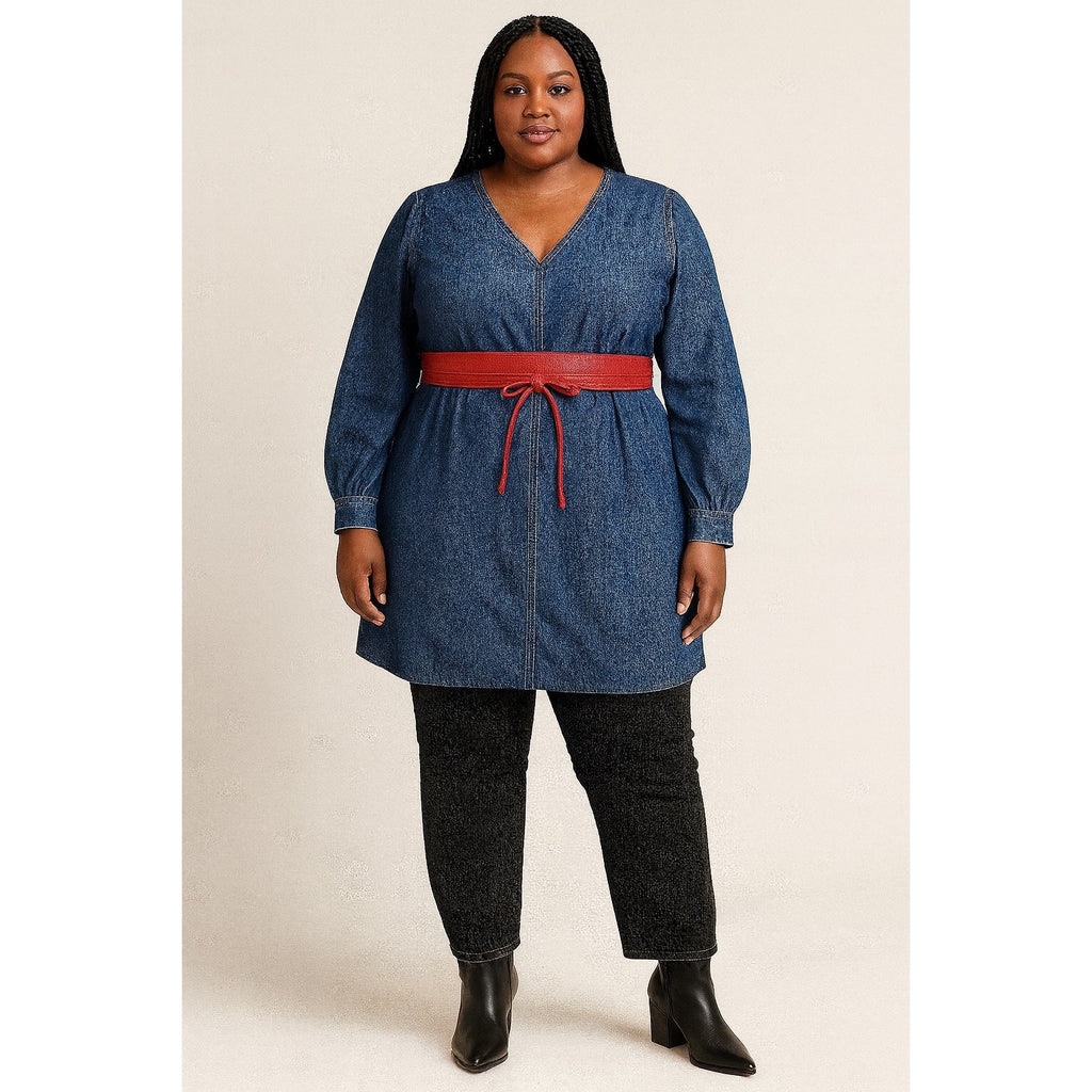 This bold red faux leather Obi belt adds instant polish to any outfit. Measuring 4 inches wide at the center, it tapers smoothly toward each end for a flattering, cinched-waist look. The belt measures 13.5 inches flat (27 inches end to end) with two 36-inch straps, making it fully adjustable and versatile for multiple styling options. Tie it in the front, back, or side to create your perfect silhouette.