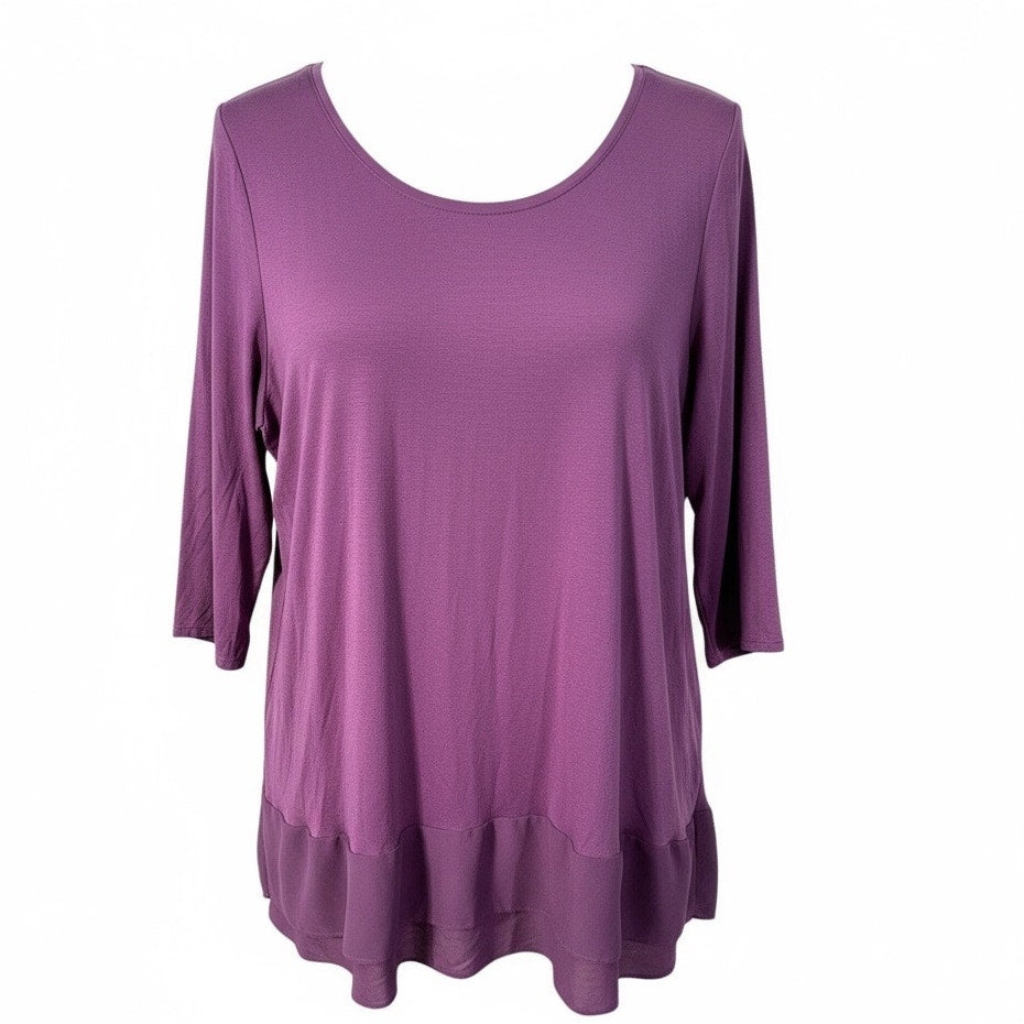 This beautiful deep purple Lane Bryant top offers effortless style and comfort. Crafted from a soft rayon-spandex blend, it features a flowing fit that skims the body and a chic woven chiffon trim along the hem for a layered look. Perfect for pairing with jeans or dress pants for any season.